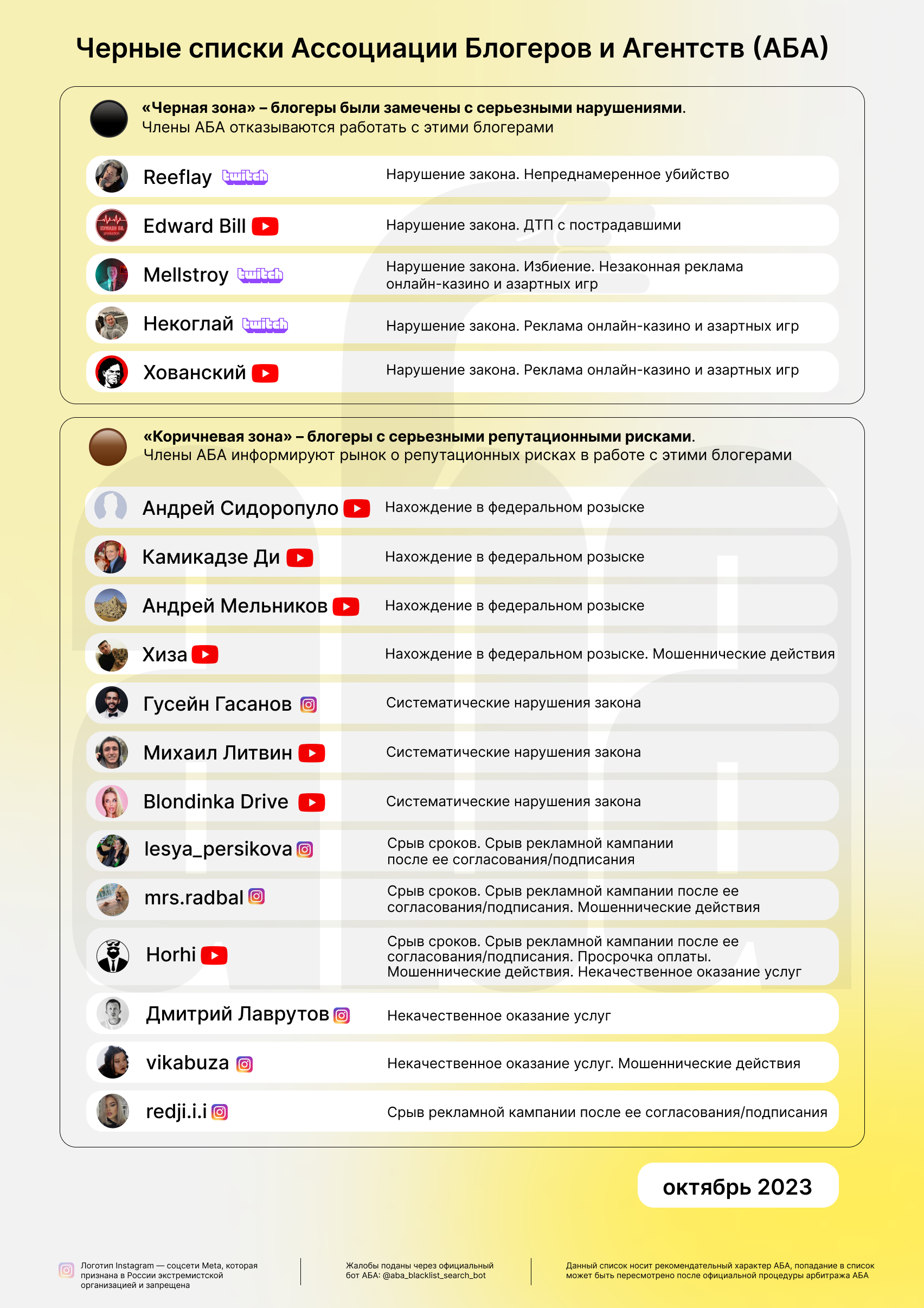 Ассоциация Блогеров и Агентств обнародовала новые имена блогеров, которые попали в списки недобросовестных игроков инфлюенс-рынка от АБА. Апдейт списка сформирован не только на основе жалоб членов АБА, но и заявлений различных игроков рынка.