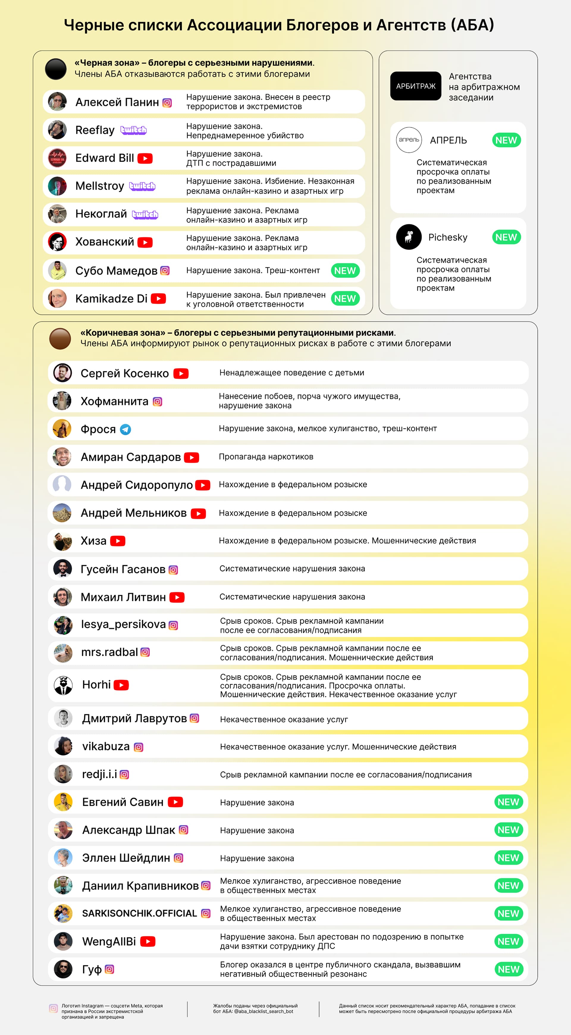 Ассоциация блогеров и агентств (АБА) продолжает развивать инициативу по саморегулированию инфлюенс-маркетинга. В апреле 2025 года Чёрные списки инфлюенсеров пополнились девятью новыми именами: Камикадзе Ди, Субо Мамедов, Евгений Савин, Александр Шпак, Эллен Шейдлин, Даниил Крапивников, Гуф (Алексей Долматов), Саркисончик и WENGALLBI.
