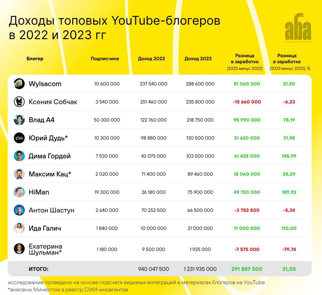 Лидером по абсолютным рекламным доходам в YouTube стал Wylsacom, заработавший в 2023 году 288,6 млн рублей. Основная причина — удорожание стоимости рекламной интеграции.