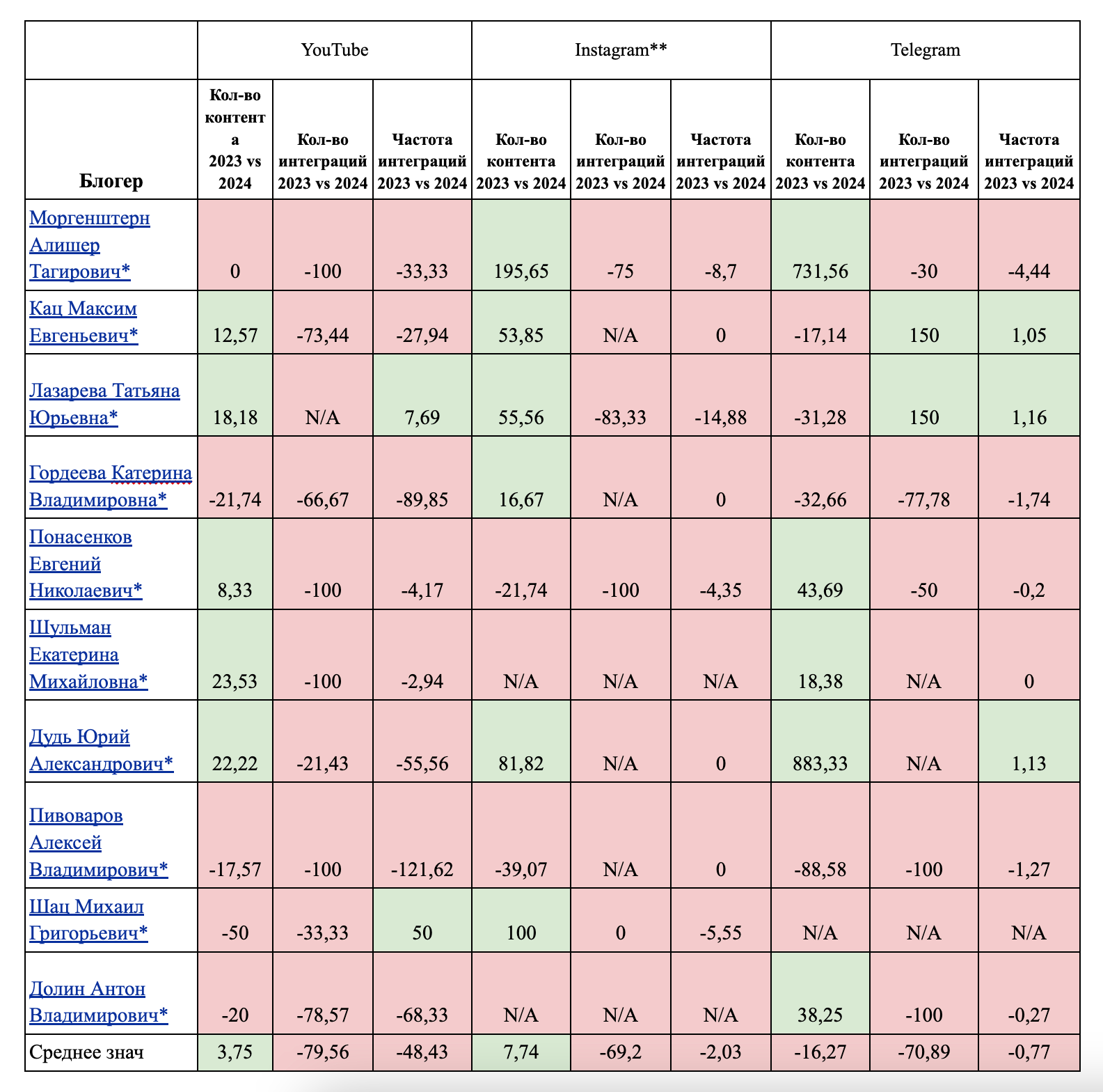 Для исследования были отобраны 10 топовых крупных блогеров, имеющих статус иностранных агентов, с активной живой аудиторией (по оценке АБА). В качестве площадок присутствия были отобраны наиболее популярные медиаплатформы: Instagram**, Youtube и Telegram. Для проведения сравнительного анализа были взяты следующие периоды: 01.01.2023 – 30.06.2023 и 01.01.2024 – 30.06.2024.