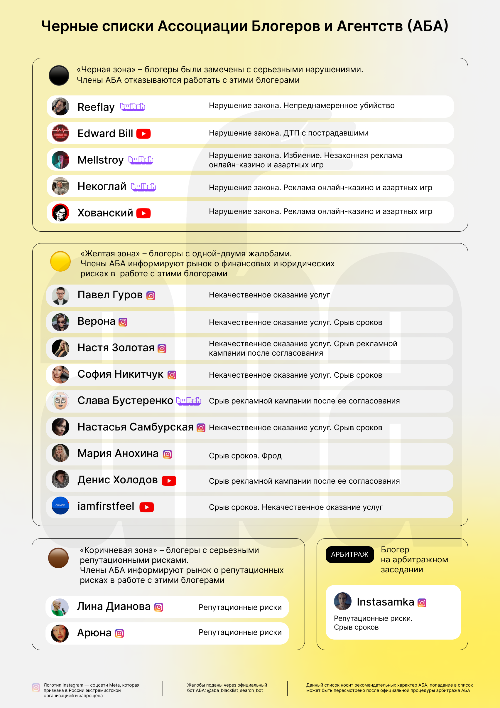 ⚫️ Черная карточка (blacklist) – «черная зона» для тех, кто был замечен с серьезными нарушениями. Члены АБА отказываются работать с этими блогерами.